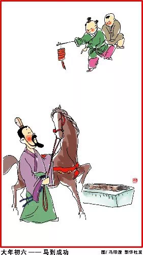 大年初六,马到成功。沥酒拜街中。万户千门看,无人不送穷。